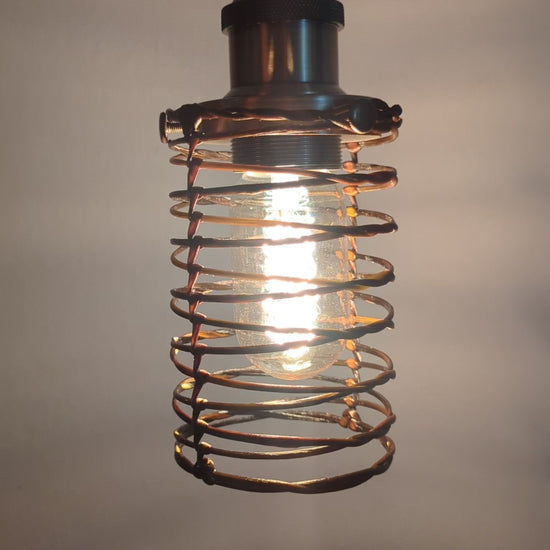 The open spiral surrounds the light source without enclosing it fully, allowing the filament bulb to remain visible and central, yet softened enough to avoid harsh glare.