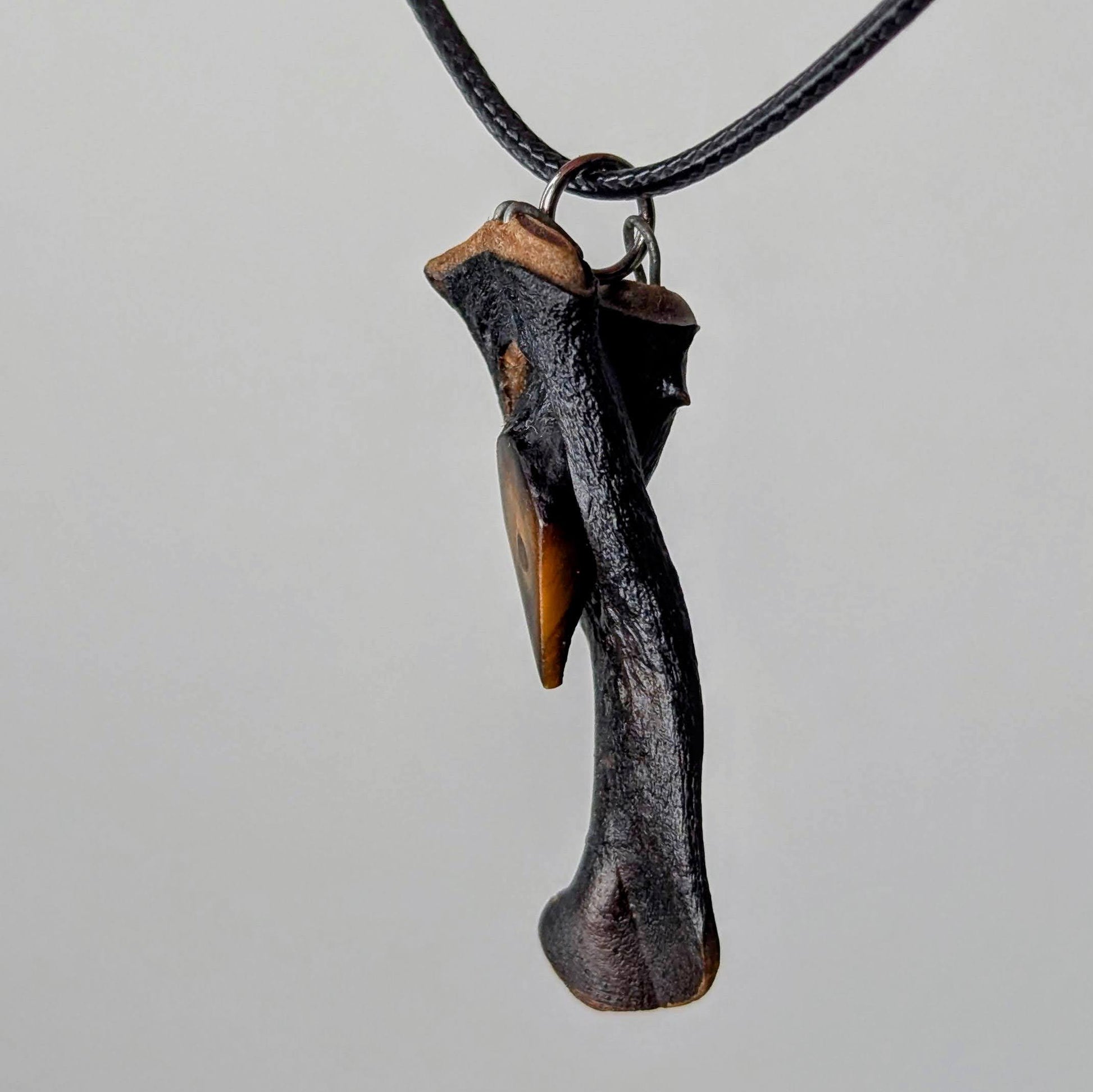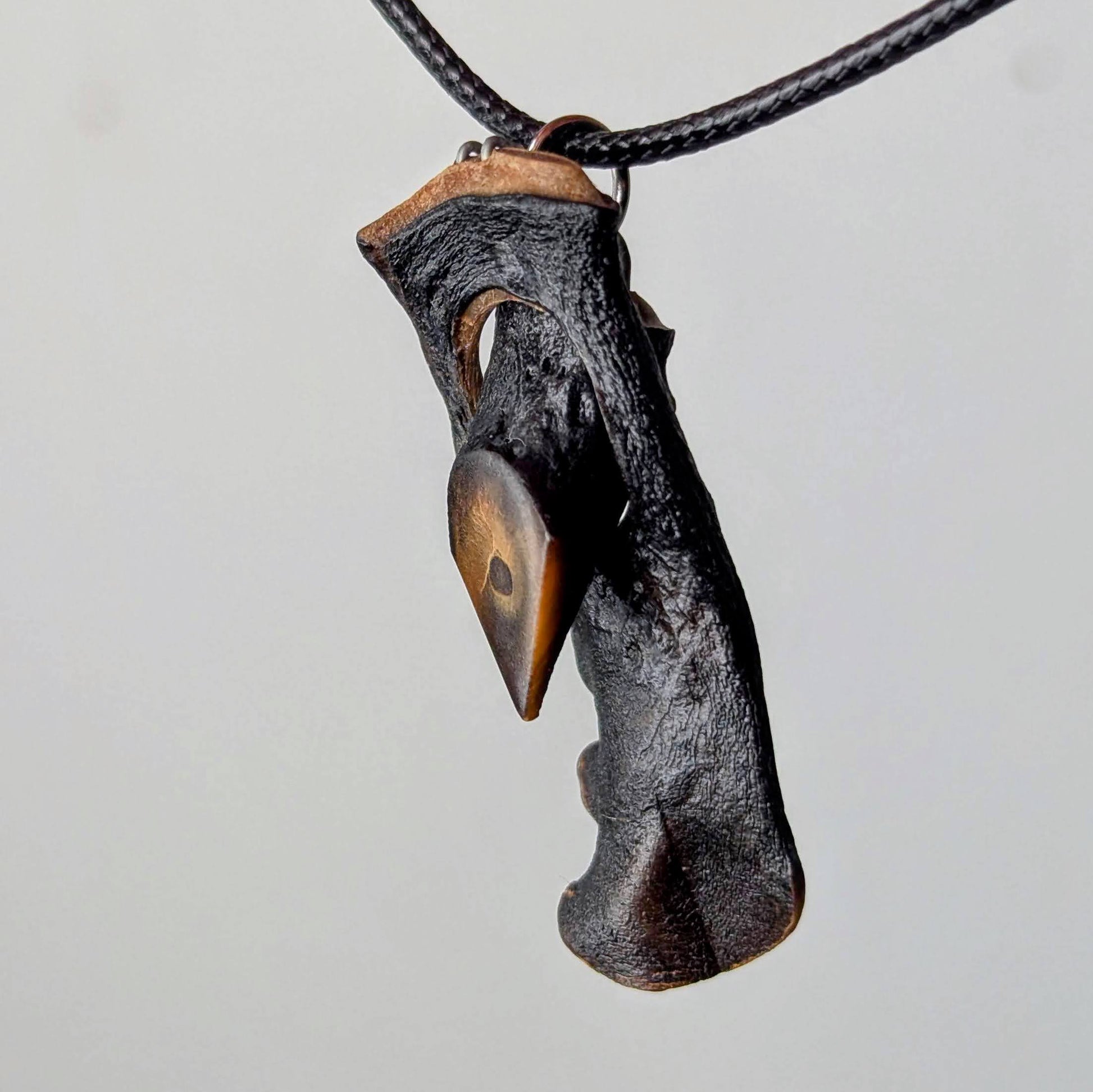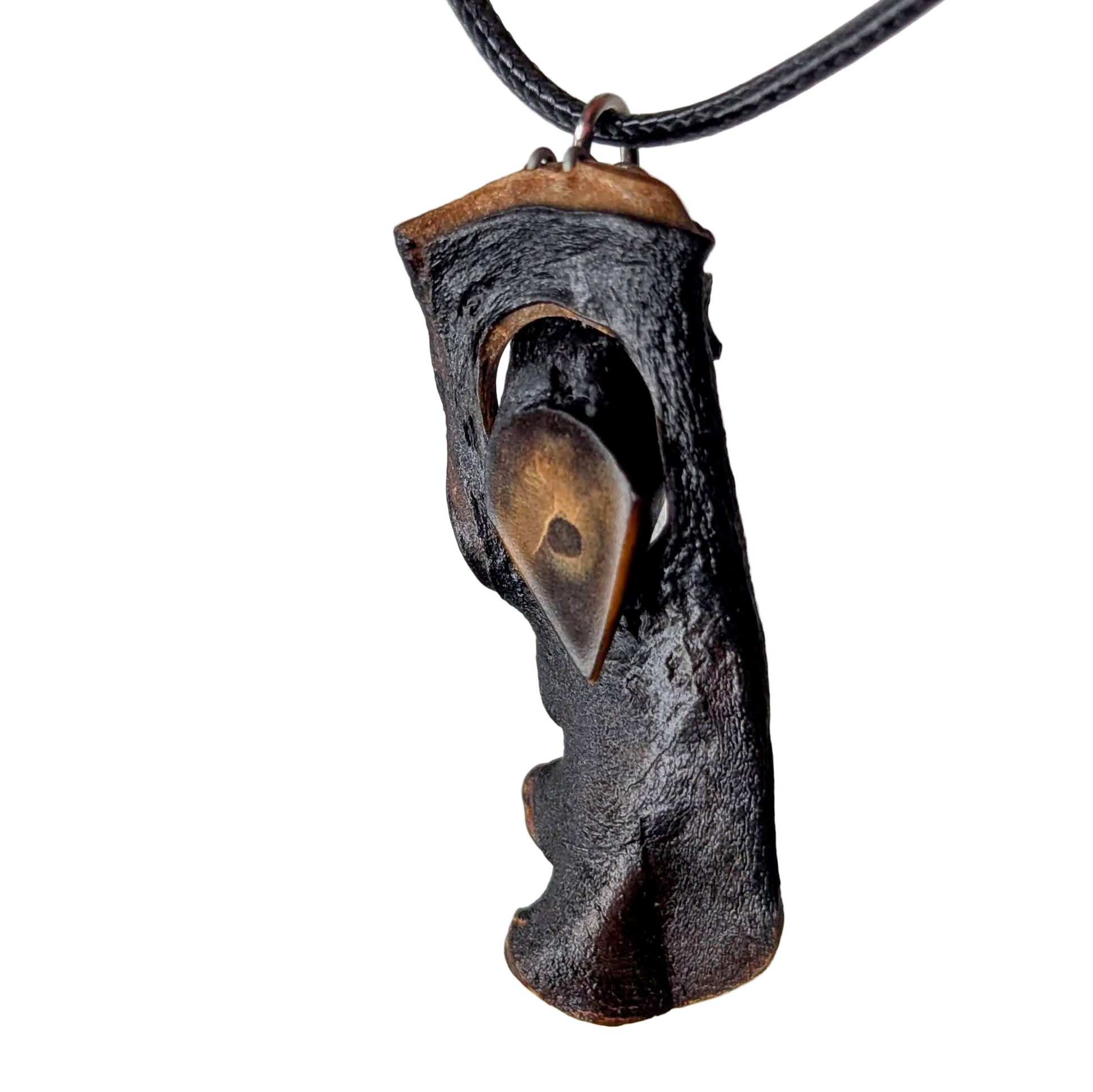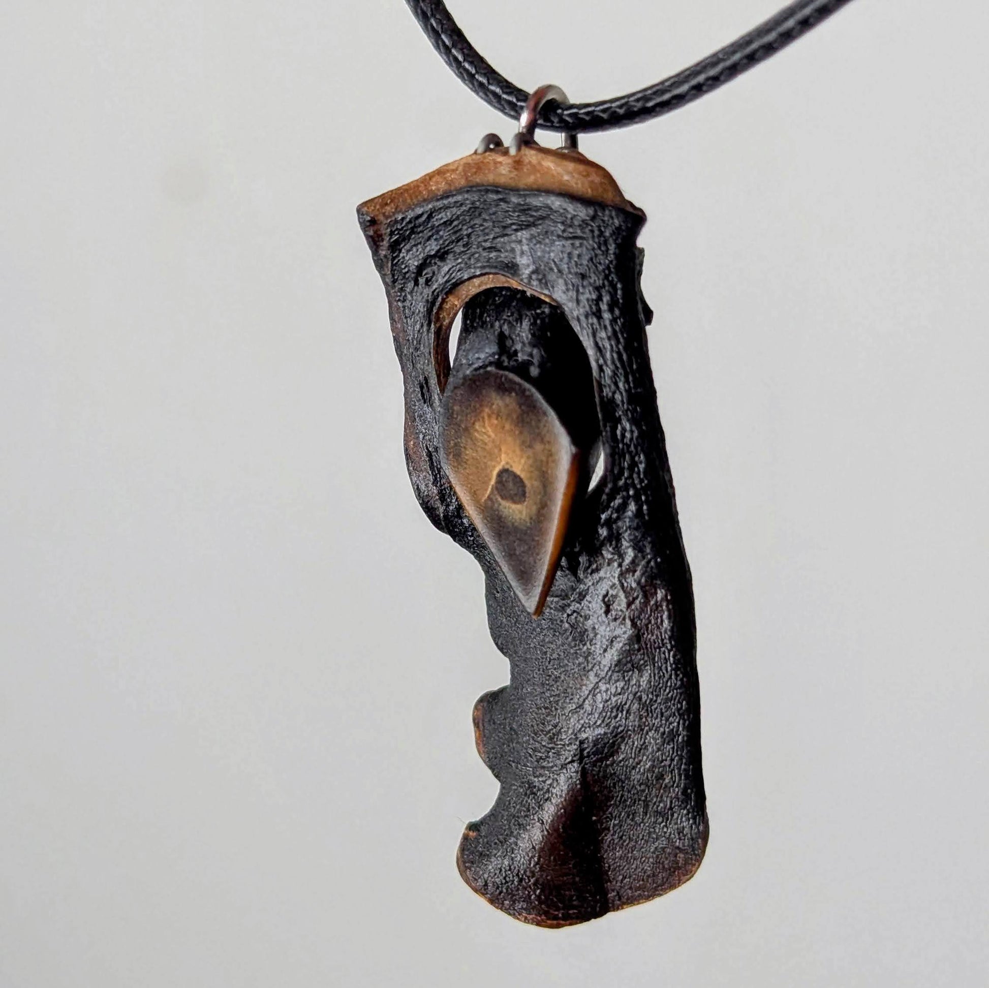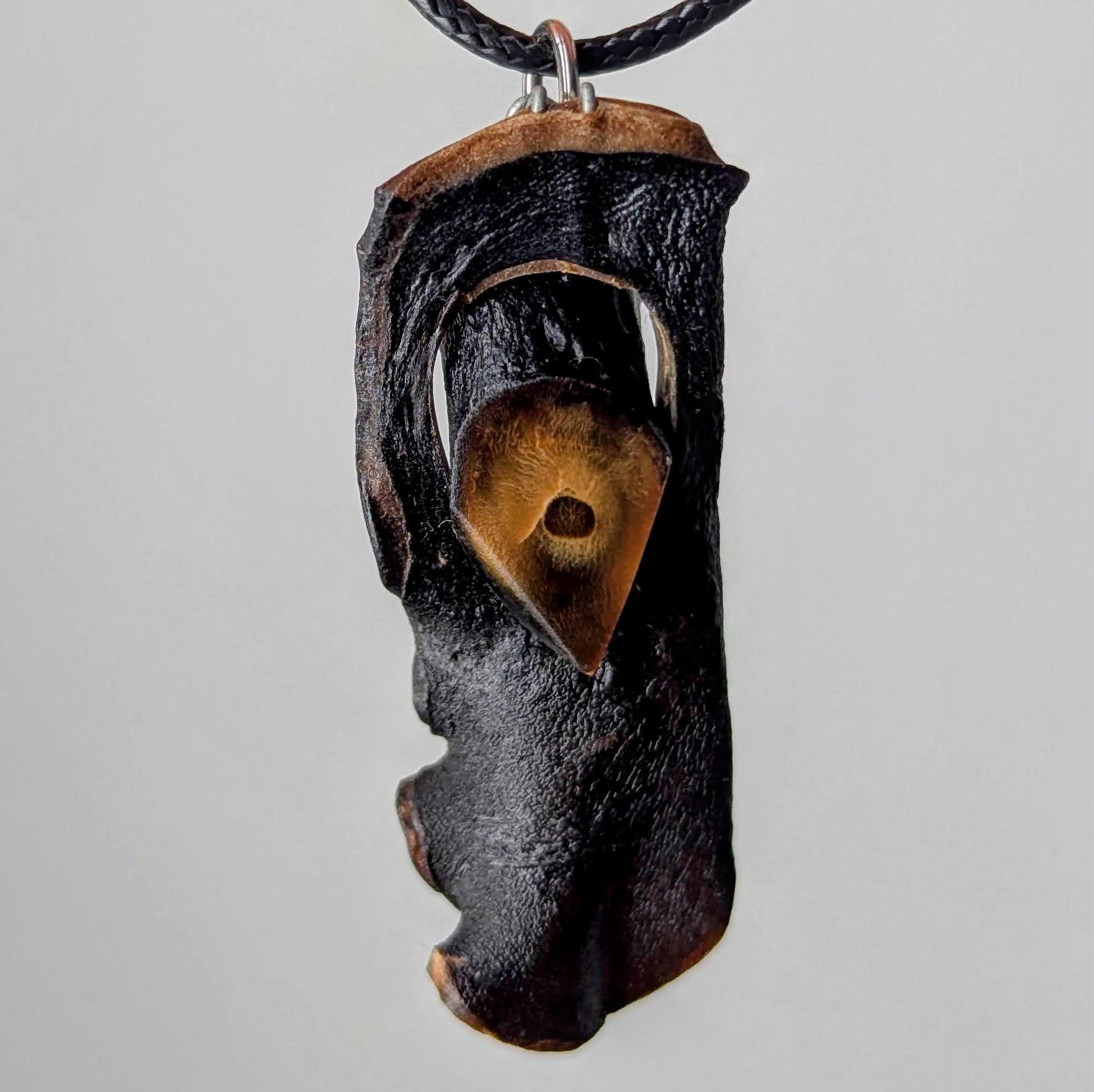 A pendant with presence. This piece, sculpted from real Heterokont algae, blends smooth and rough, light and dark in a single, arresting form. At its core, a polished teardrop-like point—amber-hued and hollow-eyed—emerges from a twisted, blackened body that feels almost skeletal.