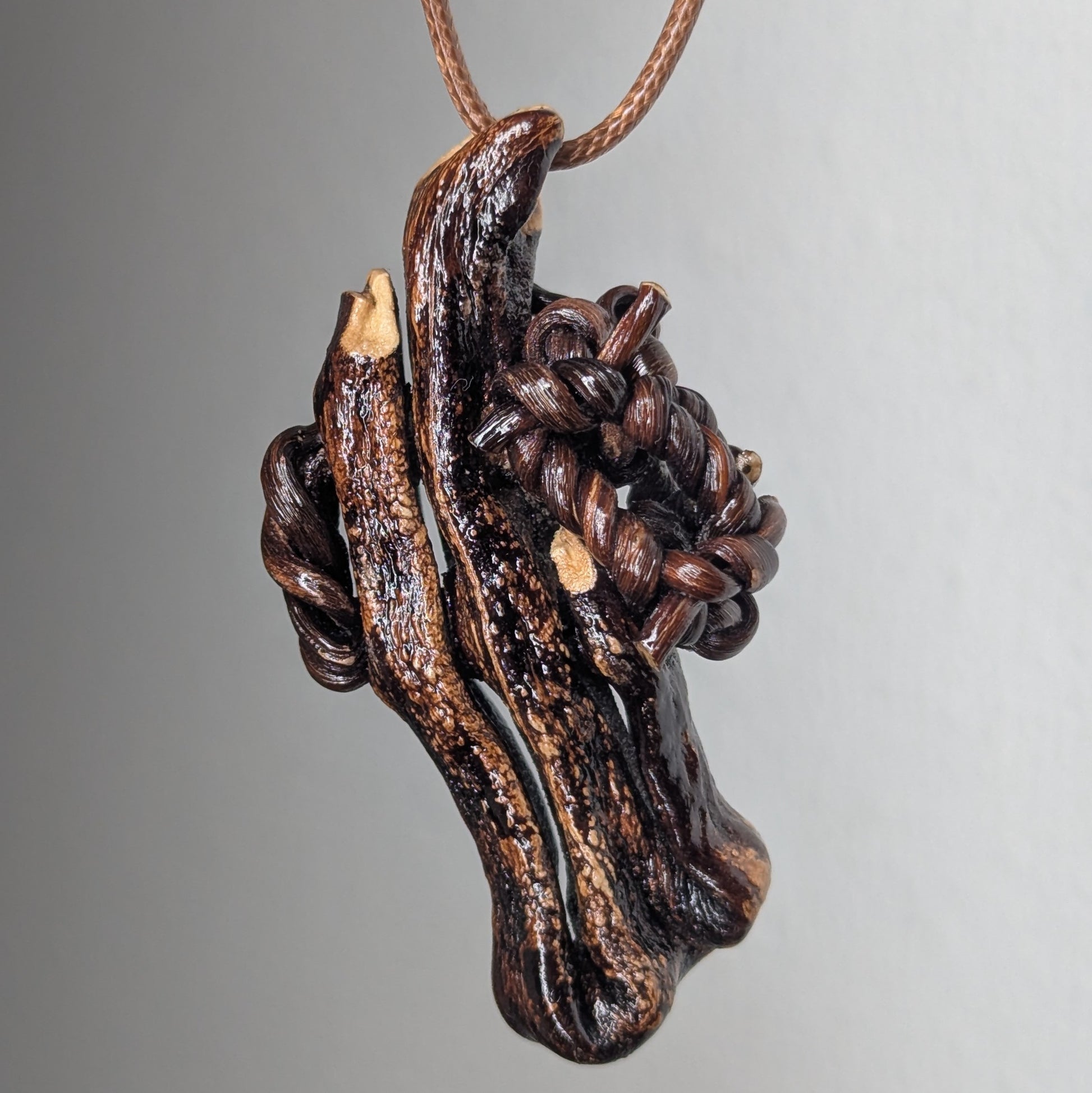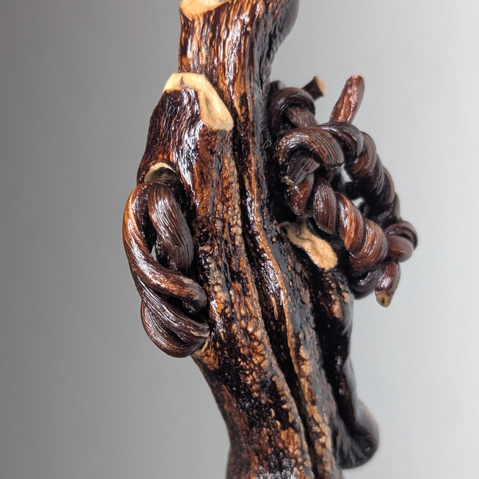 - Central body is thick, sinewy, and bark-like — with deep channels, glossy sheen, and raw beige breaks at the tips