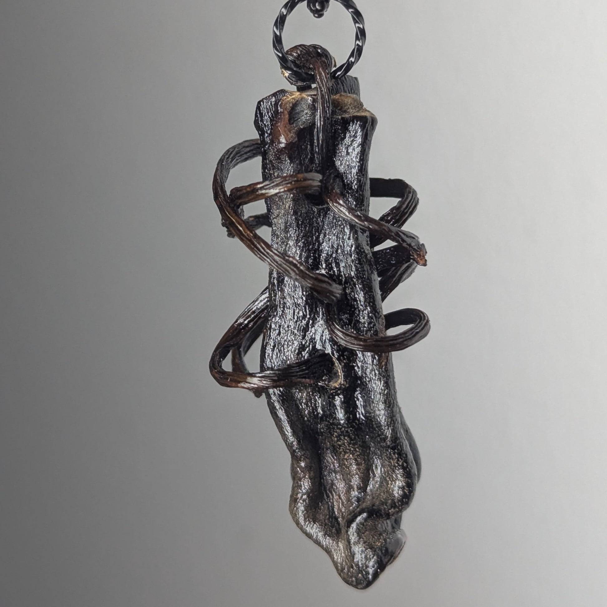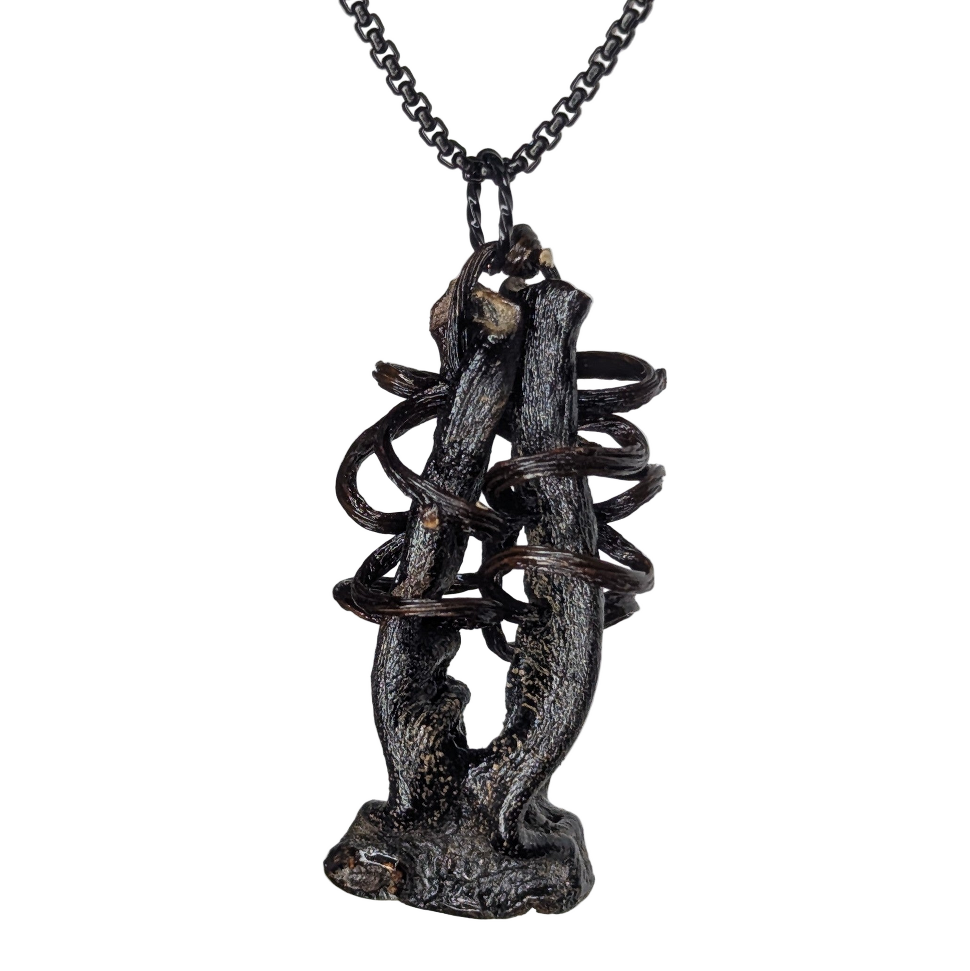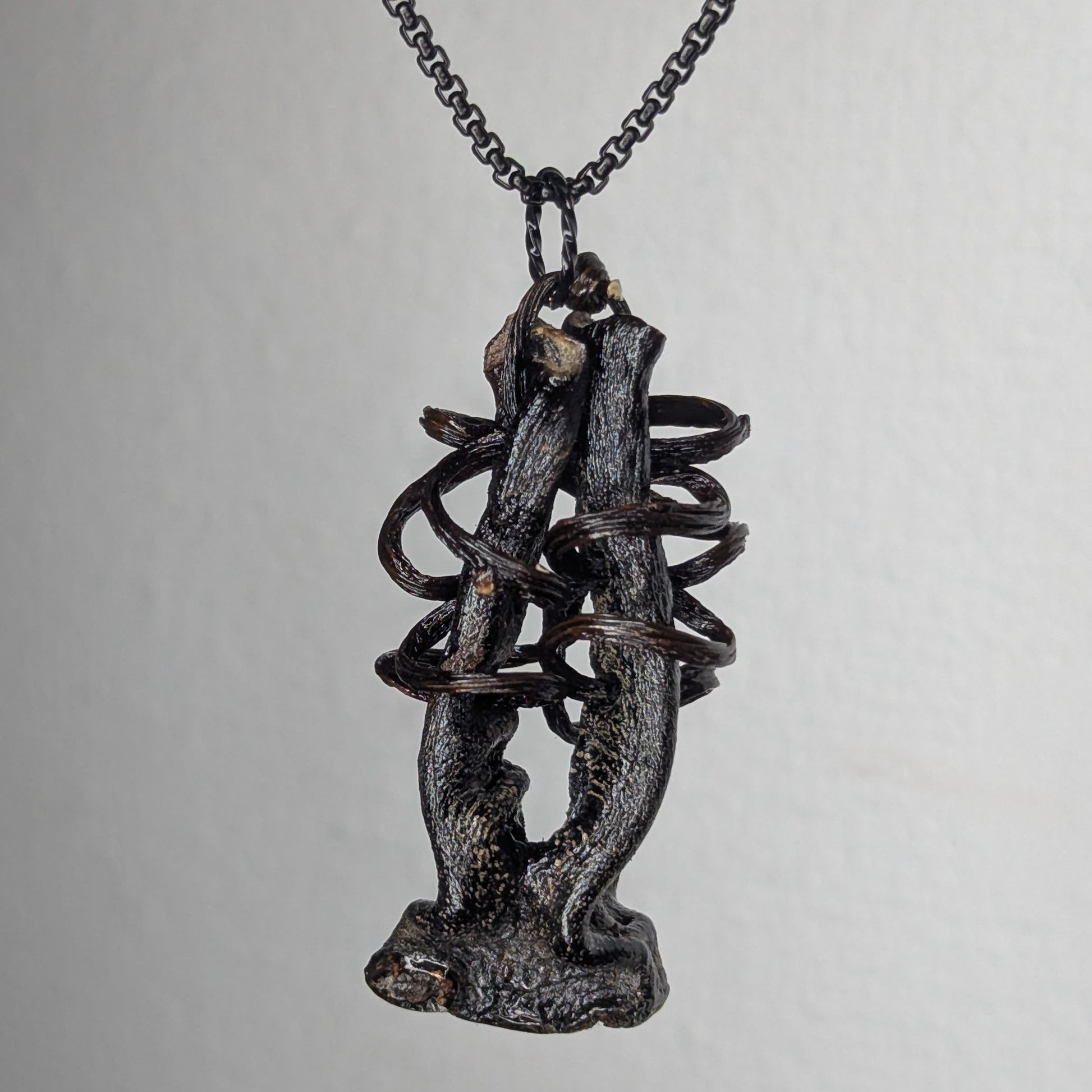 This pendant rises like a relic — two stem-like forms twisting upward, wrapped by a single unruly strand. Sculpted from wild ocean remnants you’ve never thought could be worn.
