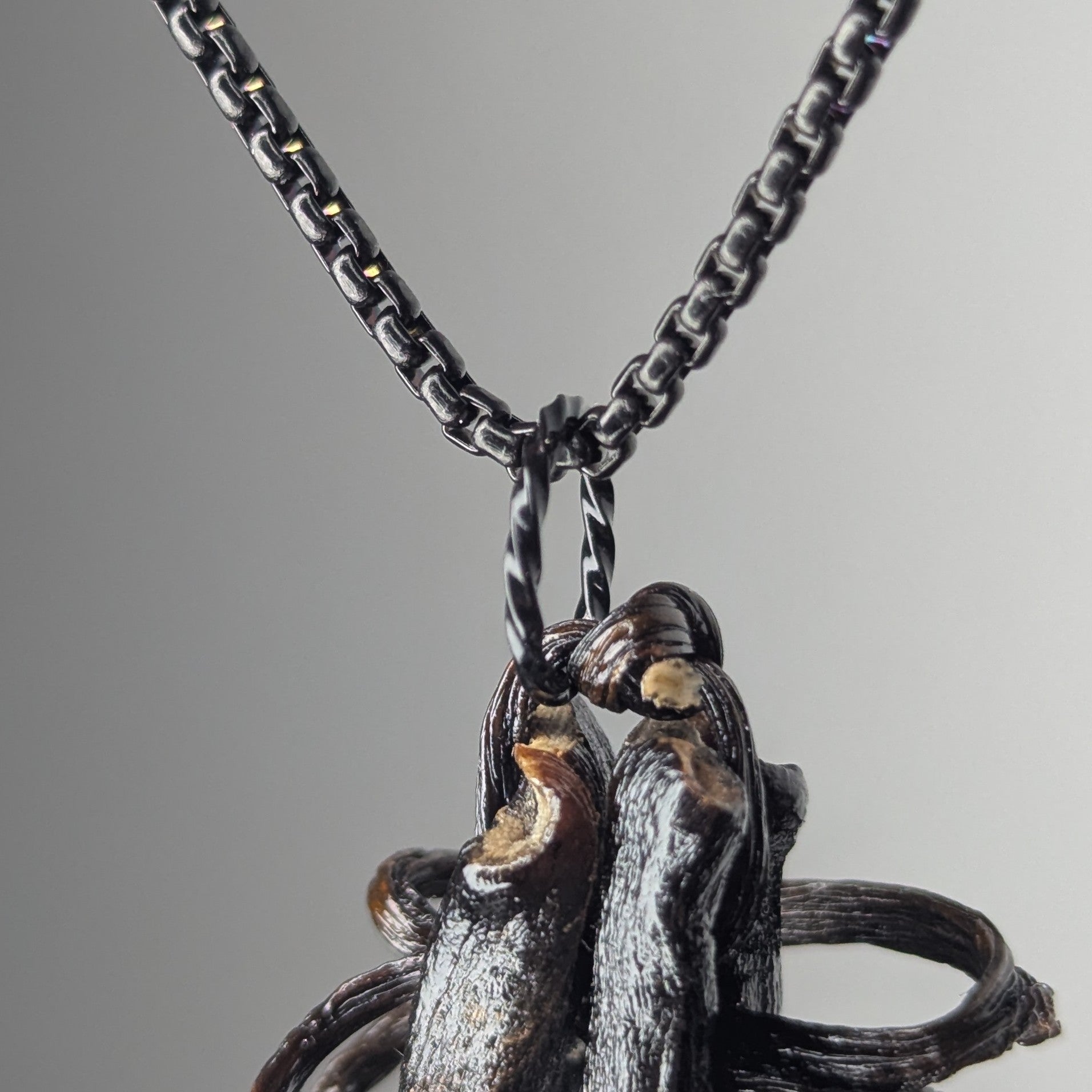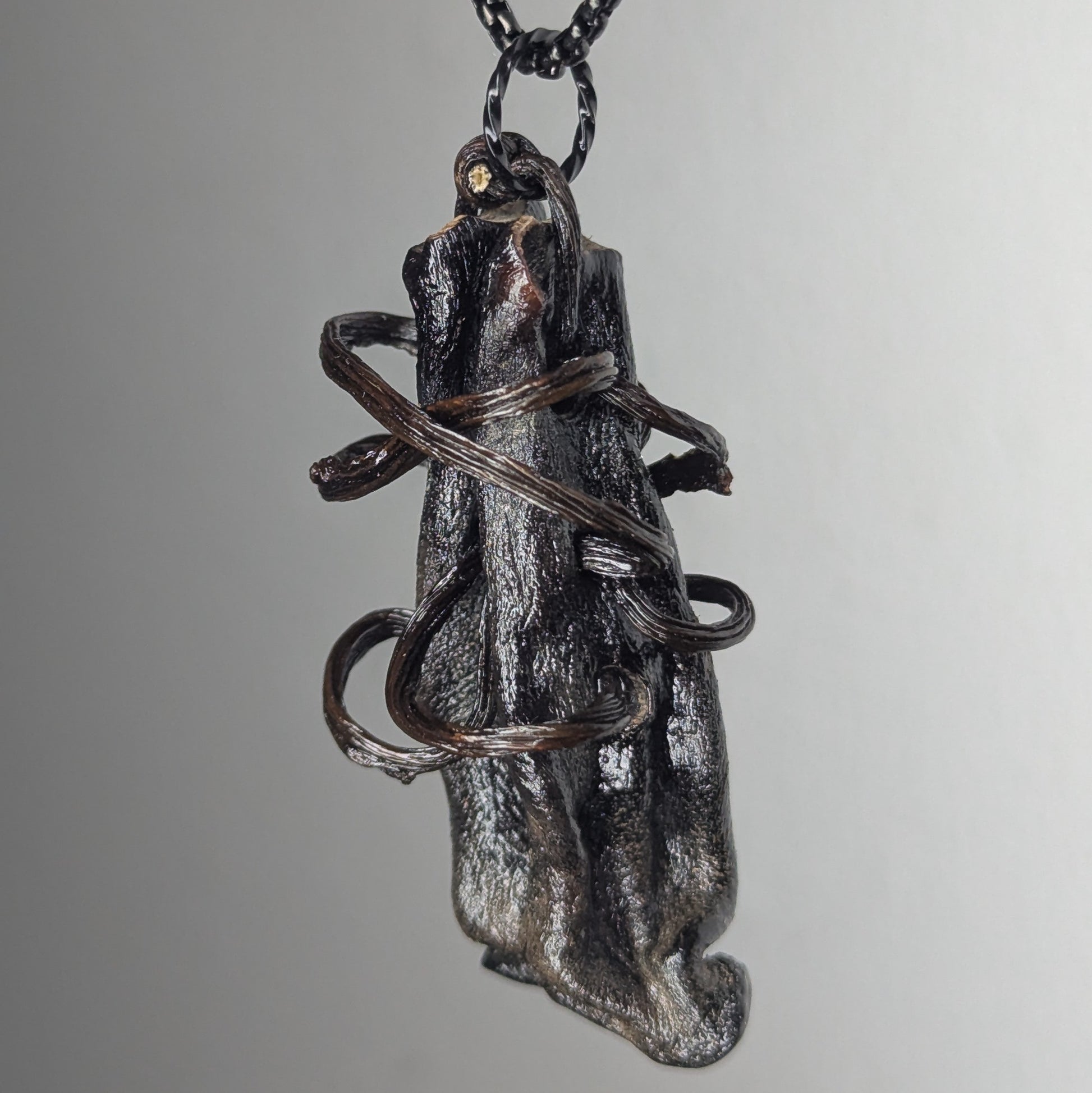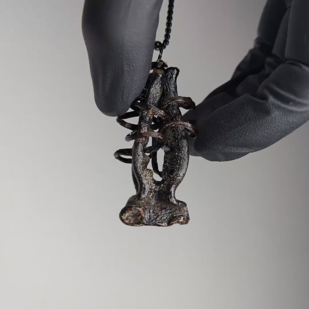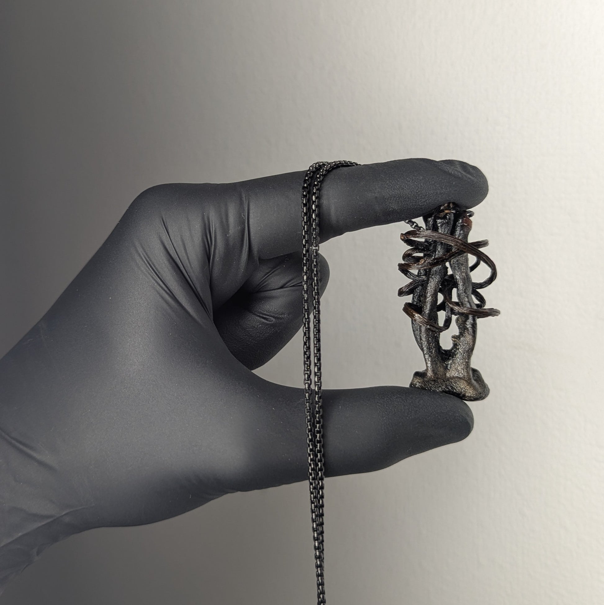This pendant rises like a relic — two stem-like forms twisting upward, wrapped by a single unruly strand. Sculpted from wild ocean remnants you’ve never thought could be worn.