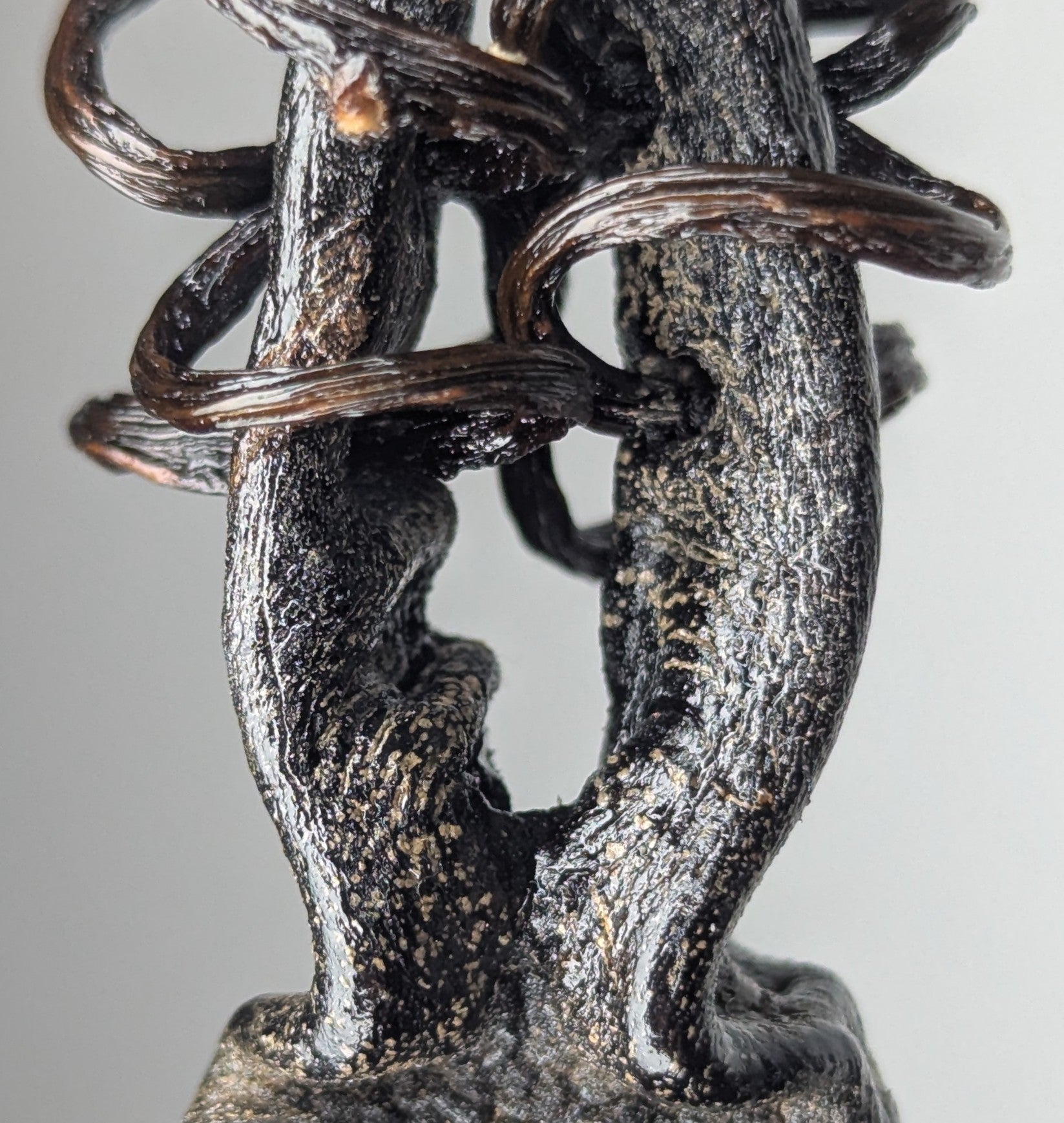 - Textures shift between matte, bark-like ridges and smoother, glossy folds