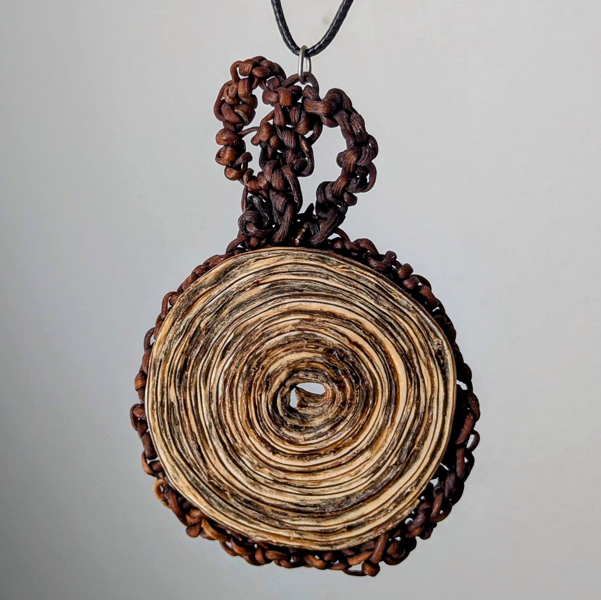 This pendant spirals like a memory etched in time. Hand-rolled from real Heterokont algae, the concentric layers resemble the growth rings of a tree or the whorls of a fossilized shell—each line marking the slow, sacred rhythm of nature. Its earth-toned ridges, worn and uneven, pulse with organic imperfection.